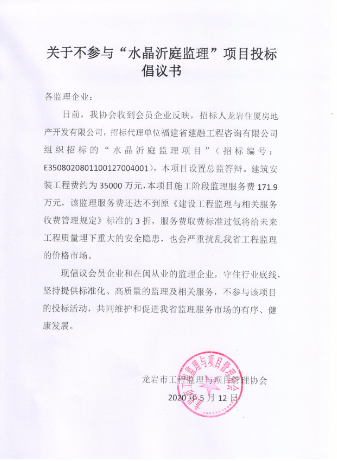 附件:龙岩市工程监理与项目管理协会《悟空手机官方网站不参与“水晶沂庭监理”项目投标倡议书》