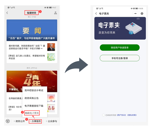 1.关注“福建财政”微信公众号,点击 【办事服务】-【财政电子票夹】 进入票夹服务。